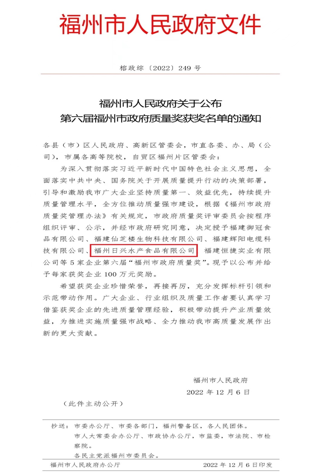On December 6, Fuzhou Government announced the Winners List of ‘Sixth Fuzhou Government Quality Award ’, which shows that Fuzhou Rixing Aquatic Food Co., Ltd. .